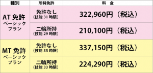 | ■ 技能教習 4,400円/h(税込) ■ 修了検定 7,700円/回(税込) ■ 卒業検定 7,700円/回(税込) |