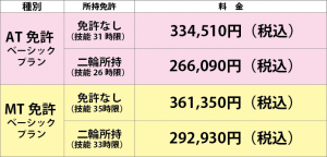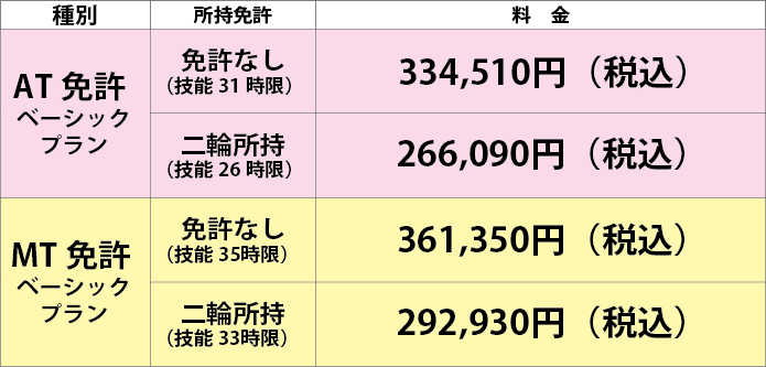 | 入学金、適性検査、学科・技能教習料金、効果測定、修了検定(1回)・卒業検定(1回)、写真代、教本代、高速教習料、安心保証付き(無料) |