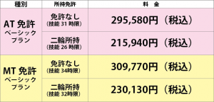 | ■ 技能教習(所内)4,730円/h(税込) ■ 技能教習(路上)4,730円/h(税込) ■ 修了検定 7,040円/回(税込) ■ 卒業検定 7,040円/回(税込) |