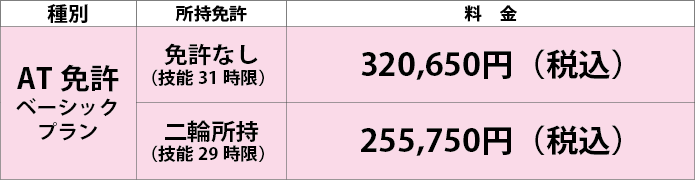| ■ 技能教習 4,400円/h(税込) ■ 修了検定 6,600円/回(税込) ■ 卒業検定 6,600円/回(税込) ※50歳までは安心プラン追加料金不要 |