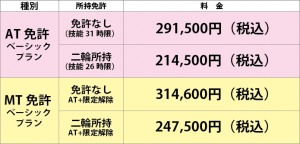 | ■ 技能教習 5,500円/h(税込) ■ 修了検定 6,600円/回(税込) ■ 卒業検定 6,600円/回(税込) |