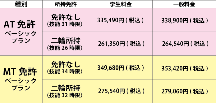 (検定不合格時の補習及び再検定料含む|自由教習は別)