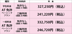 | ■ 技能教習 4,000円/h(税込) ■ 検定補習 4,000円/h(税込) ■ 効果測定再受験料 2,200円(税込) ■ 仮免学科試験再受験料 1,800円(非課税) |